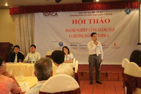 Một cảnh từ hội thảo “Giảng dạy TOPICA - Doanh nghiệp cùng giảng dạy và hướng dẫn”; Giám đốc DTK Consulting tham dự ngày 17/5/2009 với tư cách là một giảng viên doanh nghiệp. Chủ tọa (từ trái sang): TS Phạm Minh Tuấn, GĐ TOPICA; ThS Lê Đình Quang, Giảng viên môn Kinh tế vĩ mô (đến từ BIDV); ThS Nguyễn Thị Ngọc Anh, Phụ trách môn Phát triển Kỹ năng cá nhân TOPICA. Đang đứng phát biểu là ThS Nguyễn Thành Trung, PGĐ, Chủ nhiệm TOPICA Tin học ứng dụng. (Nguồn ảnh: www.topica.edu.vn) |